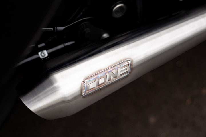 Shop NowThe Sweeper muffler uses our standard angled cone paired up with our reverse slash cut end cap giving it an 11 degree exit angle to help redirect the exhaust towards the ground. The most "moderate" sound at idle and cruising yet barks when you crack open the throttle.